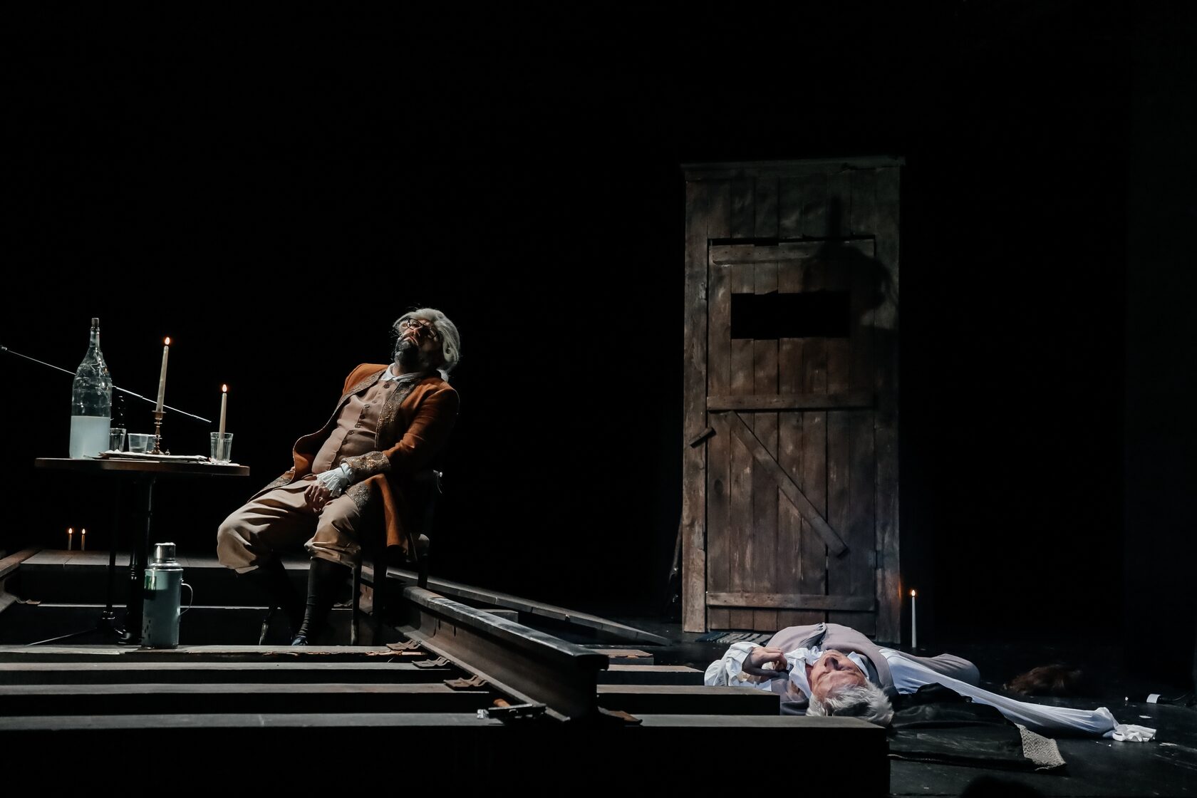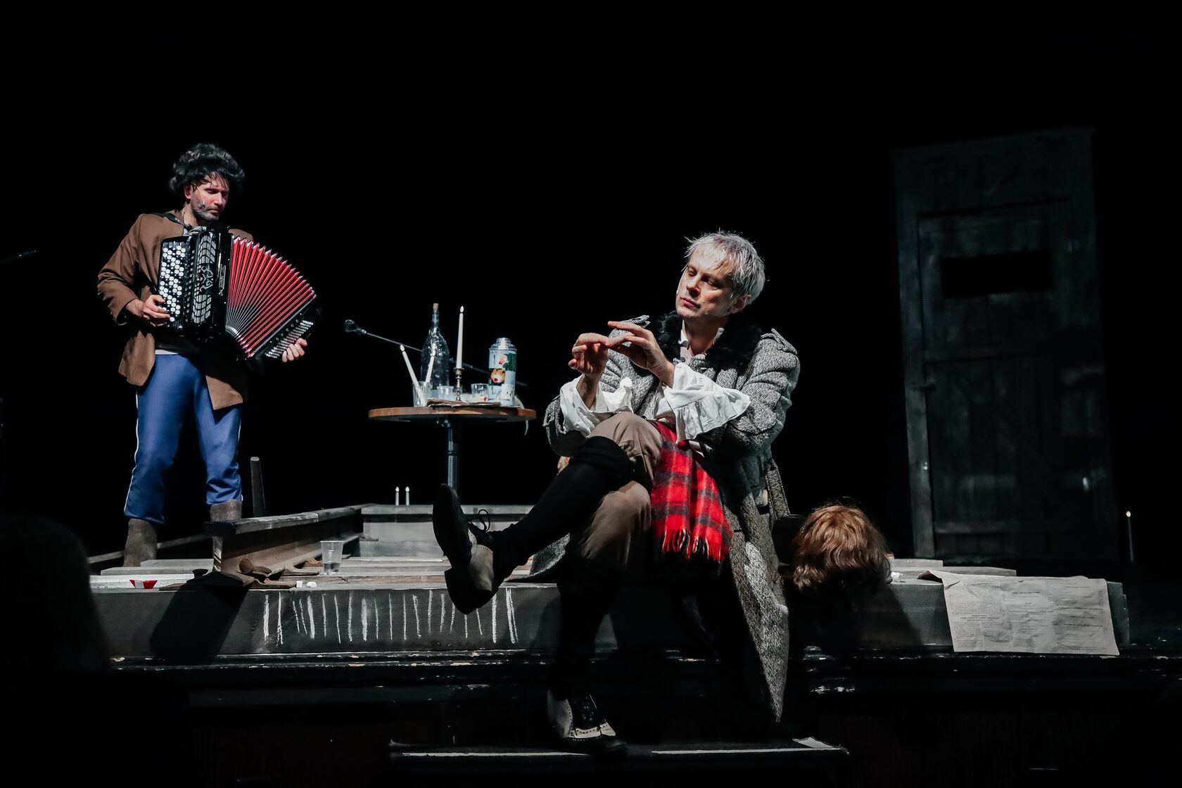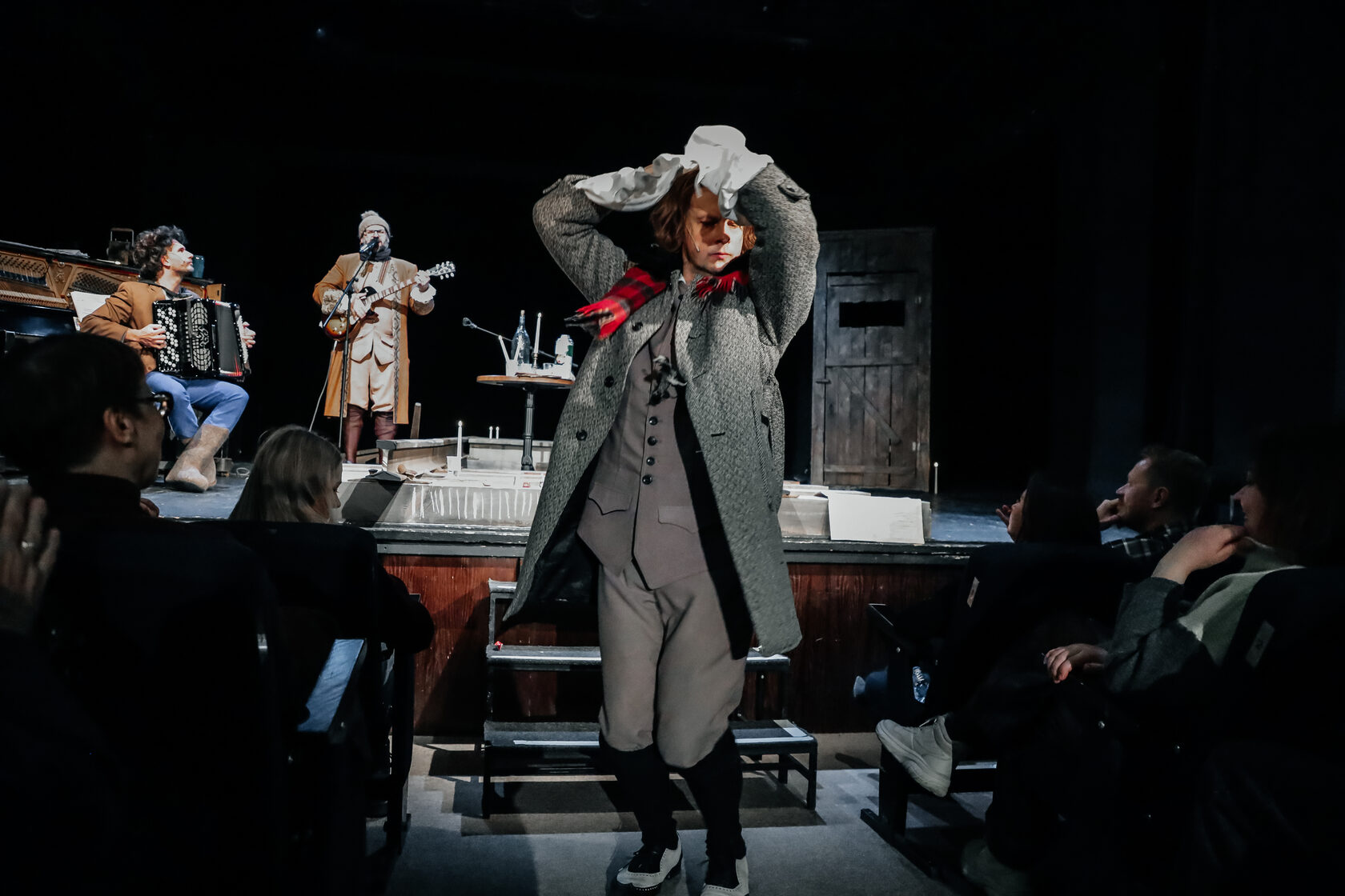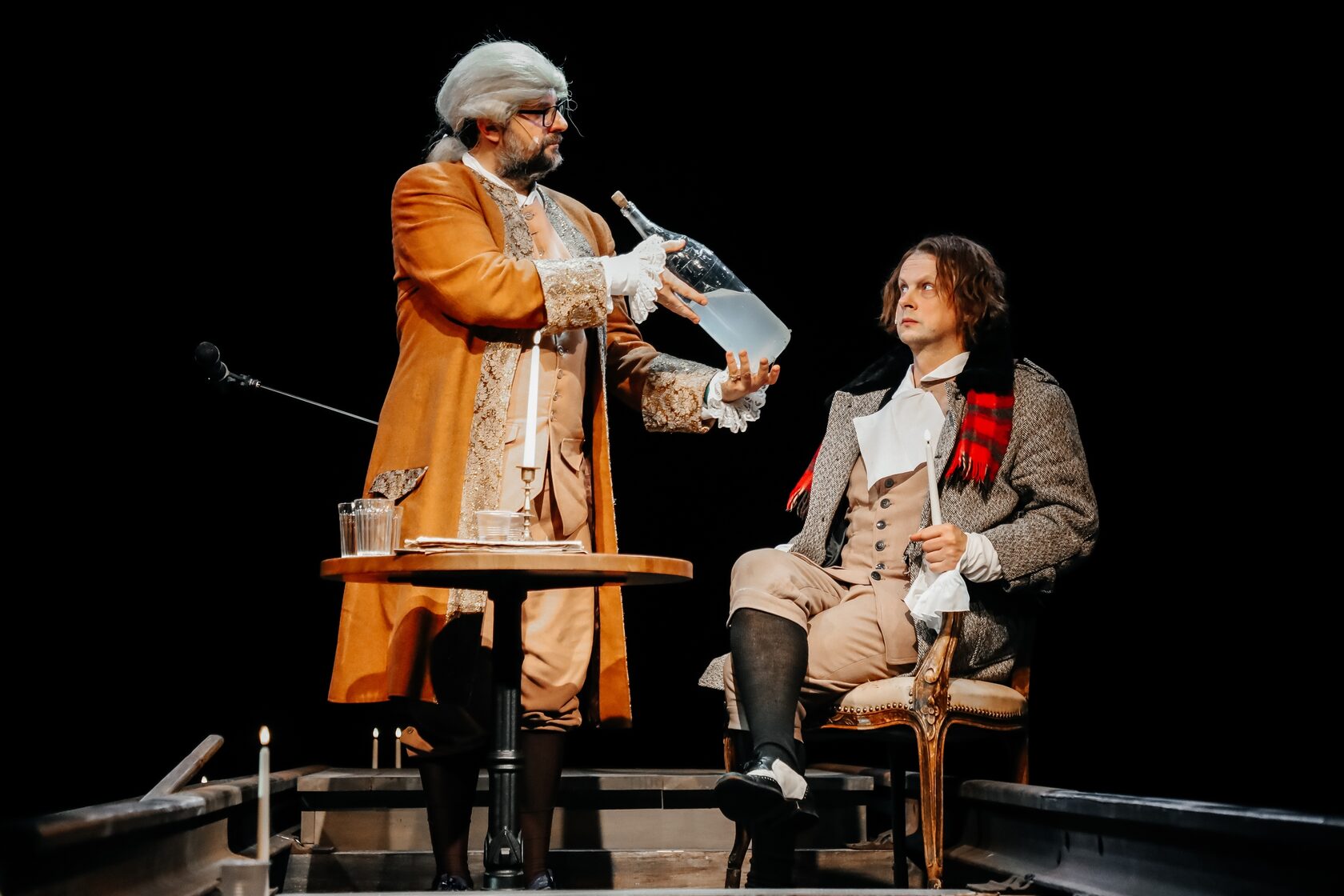 Еще один эксперимент увидели зрители «Гравитации» на сцене «Старого дома». Спектакль БДТ «Опыты драматических изучений. Моцарт и Сальери» с музыкой и звуком только заигрывали. Тотальная игра – вот смысл происходящего. Режиссер Александра Толстошева переводит пушкинскую маленькую трагедию на язык театра, размыкая пространство до перфомативного и заставляя двоих штучных актеров (Павел Юринов, Андрей Фесько) и уникального музыканта Владимира Розанова существовать внутри бесконечной импровизации. Опорная точка для самовыражения сюжетная — Моцарт и Сальери под ласково—ироничным взглядом соглядатая заперты вместе в условном «нигде» и проигрывают трагический ужин снова и снова.